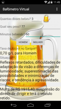 Bafômetro virtual: Calcula o teor de álcool no sangue, seu grau de atenção, quanto tempo para poder dirigir e o que irá te acontecer se for pego dirigindo alcoolizado.