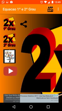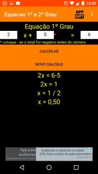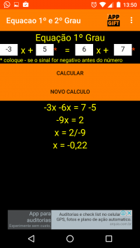 Calcula equações do primeiro e segundo grau (Baskara). Possui vídeo aulas para melhorar seu conhecimento e calculadora com raiz quadrada e porcentagem para que possa praticar o conteúdo aprendido. Tem um jogo de brinde, para passar tempo após terminar os exercícios.