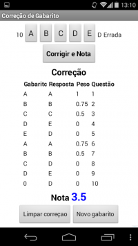 Com o APP Correção de Gabarito, você professor terá uma ferramenta para agilizar suas correções de gabarito. Funciona de forma bem simples, preencha um gabarito padrão com o peso de cada questão e assim que pronto, passe para a correção das respostas das provas, colocando as alternativas escolhidas pelos alunos. No final ele te dará a correção e a nota do aluno. Poderá ao final escolher para correção de nova prova ou lançar um novo gabarito. Por enquanto, o gabarito esta preparado para até 10 questões, caso queira mais questões, nos envie seu comentário. Esperamos que goste e nos de seu retorno sobre esse aplicativo. Baixe clicando aqui.