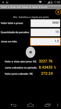Este APP calculara os valores de juros compostos, totais de parcelas, juros do período, valor de juros do período, valores presentes com base nos valores futuros entre outros valores. Pode ser utilizado por profissionais da área, alunos de administração e economia entre outros.